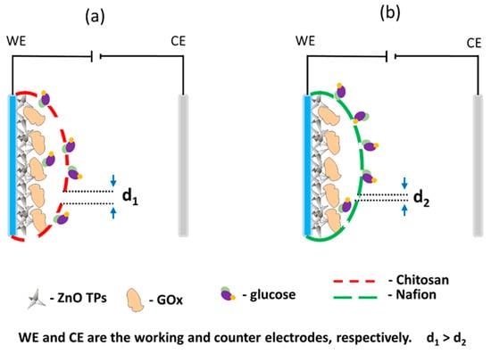 Owing to the fact that in this study, no significant improvement of (bio)sensor response was observed between ZnO TPs/chitosan and ZnO TPs/Nafion electrodes, as well as quite similar sensitivities and LODs, one may assume that the selection of the semi-permeable membrane does not play an important role in overall detection performance. Despite these similarities, there are also significant changes in CV measurements as different redox potentials. It was the oxygen reduction and H2O2 oxidation reaction on the chitosan-treated electrode that occurred at the lower potentials than for the Nafion-treated electrode, which may be explained by the different micellar structures of the semi-permeable membranes. Given the fact that electrochemical flux is highly dependent on the membrane’s micelles sizes, and the molecular weight of the analyte molecule that penetrates the membrane, it is very important to select membranes which could pass large (bio)molecules []. Taking into account that the glucose molecule is large enough to cause restructuring and plugging of micellar structure, that would affect glucose flux through the membrane. One may assume that the large glucose molecule would require a higher applied potential to seep through the smaller micelles, while bigger micelles would not interfere with glucose flux []. Thus, the lower potential of the H2O2 oxidation on the ZnO TPs/chitosan electrode can be explained by the chitosan membrane with bigger micelles than those of the ZnO TPs/Nafion membrane (d1 > d2 in Figure 6). This assumption is in good agreement with the previously reported data where the change in micelles size resulted in the changed ionic flux through the membrane [,].