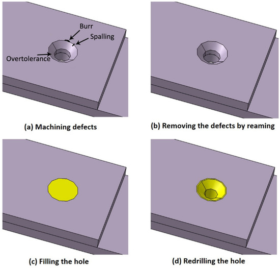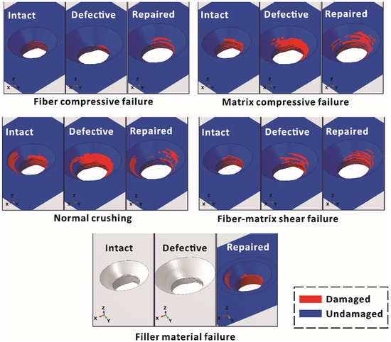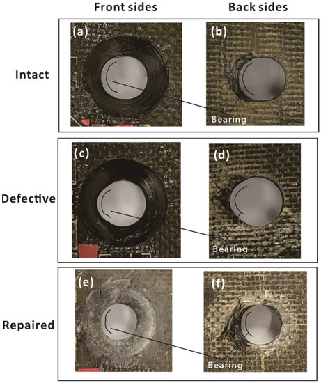 - Numerical analysis indicated that the low initial stiffness and transition point for defective joints were due to the load being transmitted by the bolt head instead of the bolt shank during initial deformation, which was caused by the large clearance and mismatched countersink. The short fiber material filled the geometric defect and improved the mechanical behavior of the repaired joints, resulting in a higher initial stiffness and failure load compared with the defective joints, which explained the repair mechanism.