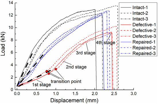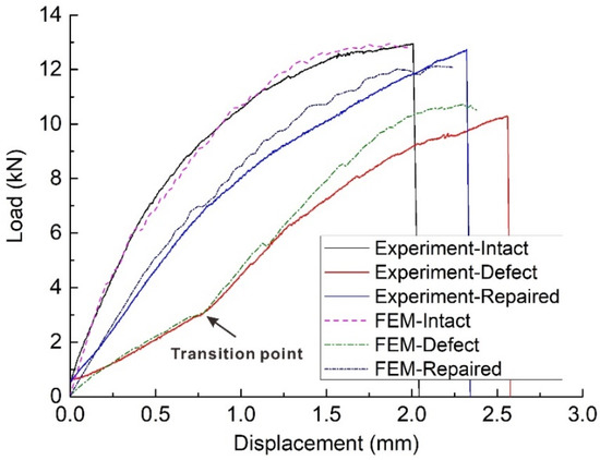 - The average failure load of repaired samples was 96.9% of intact samples (the lower and upper limit of load capacity recovery ratio were 93.4% and 99.1%, respectively). The short fiber filling repair method proposed in this study could adequately restore the ultimate strength and partial stiffness of the samples, showing excellent repair efficiency.