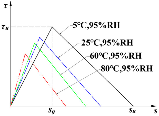 To study the influence of humidity and temperature variations on CFRP–concrete interface degradation, Zheng [37] conducted shear testing on concrete blocks externally bonded with CFRP. All specimens were exposed to an accelerated hygrothermal environment for 14 days. Degradation of the CFRP–concrete interface was significant compared to specimens without environmental pretreatment, especially with the effect of temperature. Bilinear bond–slip models were established with the tested bond parameters from Zheng’s results [37], as shown in Figure 1. The adapted parameters are listed in Table 1.