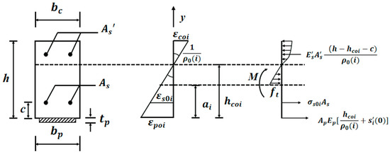 Figure 3 shows the mid-span section of the strengthened beam under fatigue loading. As the number of cycles i increases, the degradation in concrete elastic modulus causes many changes, such as crack length a0i, the neutral axis location hc0i, and the curvature ρ0i. Assuming that the cross-section strain is linear, Figure 3 shows the distribution of stress-strain at the mid-span section. The equilibrium equations can be established as follows:
