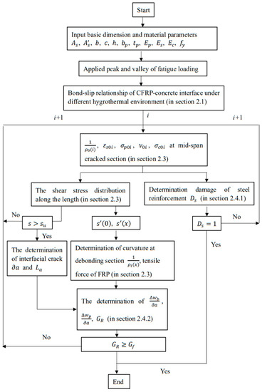Based on the prediction model, the fatigue life of CFRP-strengthened RC beams can be calculated. Figure 4 describes the implementation steps for predicting failure modes and the corresponding fatigue life. The details are as follows: