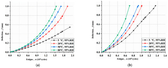 Figure 5 shows the deflections versus loading cycles before reaches 1 under different hygrothermal environments. The maximum deflection increases with increasing temperature. The reason for stiffness degradation is that the slope for the bond–slip relationship at the interface changes when exposed to various hygrothermal environments. For specimens at a peak fatigue load of 27.5 kN (Figure 5a), the corresponding maximum mid-span deflections under hygrothermal environments of 5 °C, 20 °C, 50 °C, and 80 °C are 4.35 mm, 4.65 mm, 5.35 mm, and 5.62 mm, respectively. For specimens at a peak fatigue load of 30.0 kN (Figure 5b), the corresponding maximum mid-span deflections under hygrothermal environments of 5 °C, 20 °C, 50 °C, and 80 °C are 4.85 mm, 5.39 mm, 5.35 mm, and 6.15 mm, respectively. Moreover, under the same hygrothermal environment, the maximum deflection increases with the increase in peak fatigue load.
