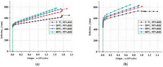 Maximum deflections under different fatigue loads and hygrothermal environments: (a) 27.5 kN; (b) 30.0 kN.