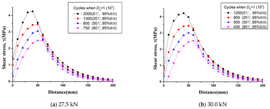 Shear stress distribution of CFRP–concrete interface in theory when Db = 1: (a) 27.5 kN; (b) 30.0 kN.