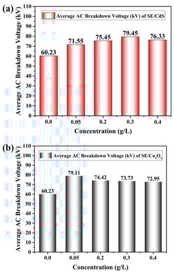 Similarly, SE/Co3O4 also exhibited a higher average AC breakdown voltage at all doping concentrations. However, SE/Co3O4 nanofluids evinced the maximum AC breakdown voltage at a doping concentration of 0.05 g/L, before decreasing with a further increase in the doping concentration but remaining higher than the AC breakdown value of base oil. Nevertheless, the average AC breakdown voltage enhancement was 31.3% compared to synthetic ester oil, as displayed in Figure 4b. Hence, it can be deduced that CdS- and Co3O4-based nanofluids presented considerably enhanced AC breakdown voltage compared to bare fluid. The introduced semiconductive nanomaterials were compatible with synthetic ester oil and capable of enhancing its dielectric strength.