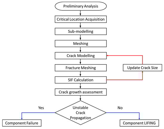 Commonly, complex structures with cracks are modeled through FEM because of its simplicity and versatility [7] using two main approaches. The implicit approach—also called smeared crack approaches—models the cracks using constitutive material models consistent with continuum damage mechanics (CDM) [8,9], while the explicit approach models the cracks through geometric entities. The explicit approach is suitable when dealing with structures with predefined crack paths. In this work, the explicit approach is used, as the crack growth direction is predefined by field feedback experience. On the one hand, working with FEM implies complex remeshing strategies as the crack evolves, especially under mixed mode conditions [10,11,12].