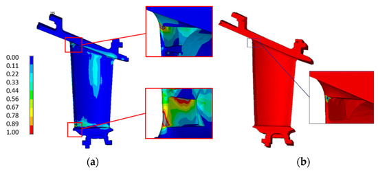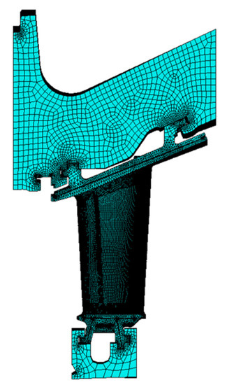 The equivalent von Mises Stress at the GT vane and the displacement were attained. Furthermore, the two main damage mechanisms produced at the extreme working conditions—creep and thermo-mechanical fatigue—were also evaluated. Creep analysis was performed at different times according to maintenance intervals. The fatigue analysis was carried out with two different approaches, namely, considering or not the stress relaxation due to creep strain increase. In the first approach, no stress relaxation was considered, hence evaluating the number of cycles to crack initiation in the worst possible condition, , whereas the second approach was performed considering the stress relaxation attained due to creep, which provides a higher number of cycles to crack initiation because this relaxation produces a shifted effect of the load cycle mean stress.