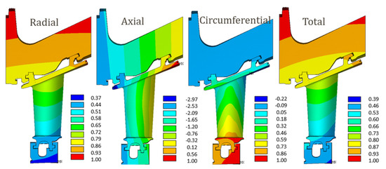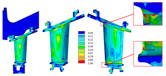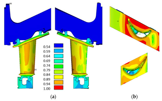 Figure 3 and Figure 4 show the boundary conditions, normalized to the maximum value, in terms of mechanical loads and temperature distribution. Figure 3 illustrates the pressure distribution along the components such as external airfoil, inner and outer platforms, internal cavities, etc.