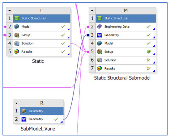 Figure 6. Sub-model attached to the engineering data and solution of the full model in ANSYS Workbench. - The following loads are applied to the-sub model: