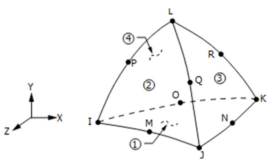 The rest of the sub-model was meshed with quadratic tetrahedron elements, such as the element SOLID187, with dimensions of 1.5 mm. This element is a higher order 3-D, 10-node element with a quadratic displacement behavior, well suited to modelling irregular meshes. The element geometry is illustrated in Figure 8. Figure 9a shows the refined mesh, while Figure 9b details the sphere of influence that give a more refined mesh around the critical location.