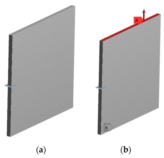 Test plate: (a) test plate with a rectangular crack shape in the middle of the specimen; (b) test plate with the normal force applied on the top surface (A) and constrained at the opposite surface (B).