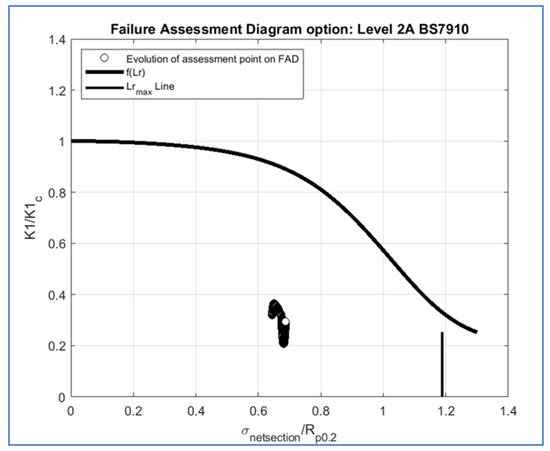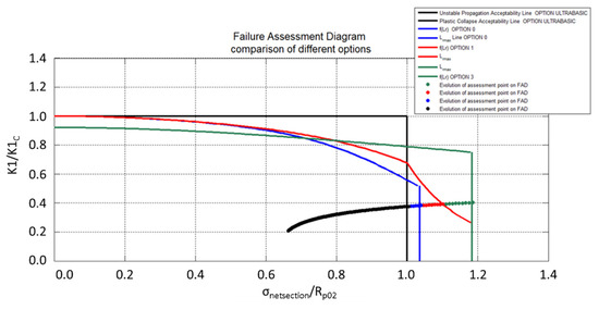Propagangui evaluates the failure of a component with a crack using the failure assessment diagram (FAD), reported in Figure 13 as an example. International standards and codes of practice [32,33] recommend slightly different implementations of the failure assessment line. Additionally, different calculation options are available depending on the type of input available and accuracy required. Figure 13 illustrates how the assessment result is affected by these choices. Its main objective is to assess whether the component will fail when it crosses the FAD line or maintain a stable behavior. The X-axis reports the variable where an exceedance of its limit implies plastic collapse. The yield stress is also referred to as .
