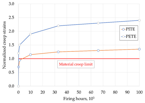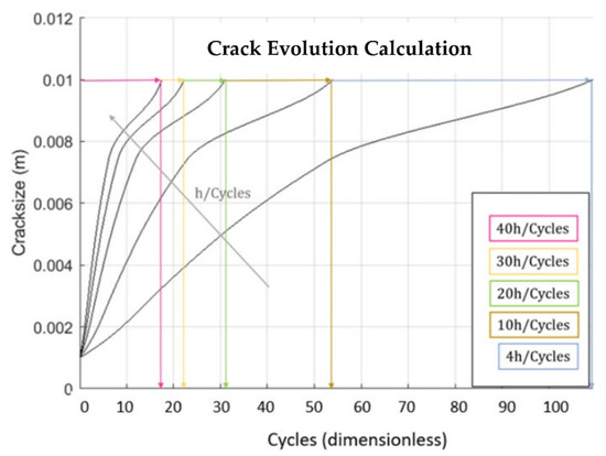 Figure 27 depicts the evolution of the cracks at the different operating cycles. This graph gives the number of cycles needed to reach the expected crack length, namely 2, 3, 5, and 10 mm. Data represented in Figure 27 can be rearranged to create the FH–NS diagram, where FH are the firing hours, and NS (normal shut down) are the cycles. It is also worth noting the different rate of crack growth at each operating cycle. The number of cycles to reach the limiting crack length (10 mm) decreases with increasing firing hours per cycle. This result is because with a higher number of hours per cycle, the total number of hours to reach limiting crack length (as shown) is much higher, and therefore, the phenomena of fatigue, creep and oxidation count much more, arriving to the limiting crack length earlier.