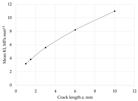 Nevertheless, the SIFs were computed by applying the interaction integral method at each node found along the crack front in six different path contours. To study all these values, it was decided to calculate the mean value of the five-last contours—the more reliable ones—which gave the average found at each node along the crack front. However, to obtain a clear evolution of with length a, the average value of the found along the crack front was evaluated.