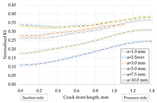 The results presented in this analysis show unexpected behaviors of SIF From a theoretical point of view, the increase of with the increase of is expected. However, in this work the reduction of with increasing crack length after a certain crack length value was achieved. This result can be explained with the complex geometry of the vane in addition to the extreme working conditions that allow a stress redistribution at the crack front apex. This stress redistribution was predicted by the simulations. Therefore, due to this phenomenon, no unstable amplification of the stresses along the crack front is expected.