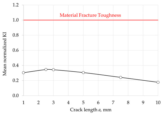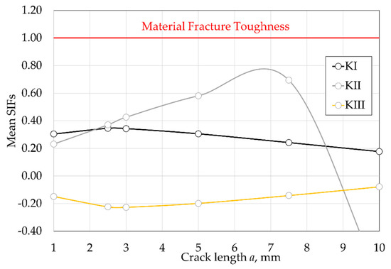 Furthermore, the two other SIFs, and , were also determined, and the results are shown in Figure 23, normalized with the material fracture toughness. Both and were lower than , but of the same order of magnitude. Additionally, from the comparison with the material fracture toughness, it is also important to note that unstable crack propagation was not expected from this first analysis, since the fracture toughness was well above the SIFs obtained.
