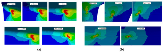Moreover, the equivalent von Mises stress at PETE for each crack length is represented in Figure 22. Figure 22a shows the equivalent stress at the pressure side of the airfoil, where a redistribution of stress at the crack apex can be seen. Additionally, from Figure 22b, a lower stress is predicted at the crack apex, confirming that at the suction side is lower than that on the pressure side.