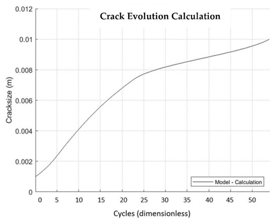 This section reports the results obtained with the simulation performed with the code Propagangui. Figure 24 shows the crack growth evolution with the number of cycles, considering the equivalence 1 cycle = 10 firing hours. The software stops the calculation when the crack length reaches 10 mm, which is the last crack length for which the SIF was obtained. The slope of this graph represents the crack growth rate. The slowdown as the crack evolves is evident, meaning that the rate of crack propagation decreased.