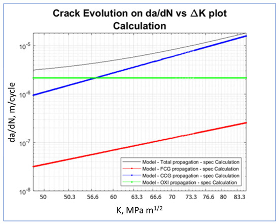 On the other hand, Figure 25 shows the crack propagation rate as a function of SIFs. This plot emphasizes the linearity of the fatigue and creep propagation with SIFs, as expected from Equations (5) and (6), and the non-dependence of the oxidation contribution. Figure 26 shows the failure assessment diagram (FAD). The evolution of the assessment point at different cycles was within the limits. Therefore, neither plastic collapse, nor unstable propagation was expected.