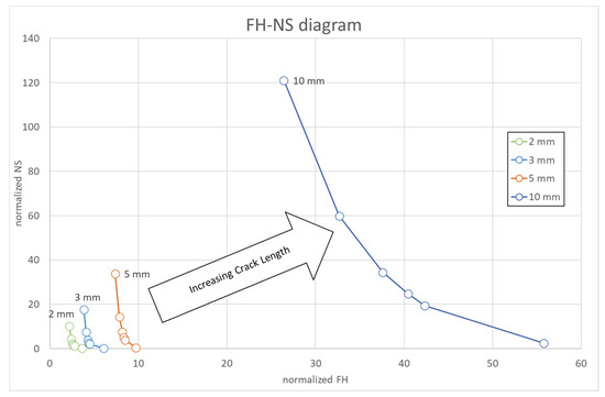 - The estimated crack size curves on the FH–NS diagram emphasize the slowing of the crack propagation.