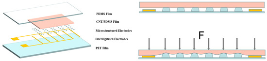The bottom layer of the flexible pressure sensor was a layer of flexible PET film. The top layer of the flexible PET film was an electrode, which was composed of an interdigital electrode and microstructures. To ensure the sensor had high sensitivity, the flexible film for the uppermost package of the flexible pressure sensor was made of PDMS material, which had good elasticity. The lower layer of the PDMS film was a rough active material layer prepared from CNT/PDMS composites, which had excellent electrical conductivity. CNT/PDMS composites are widely used in pressure sensors. A schematic diagram of the structure and working principles of the sensor is shown in Figure 1.