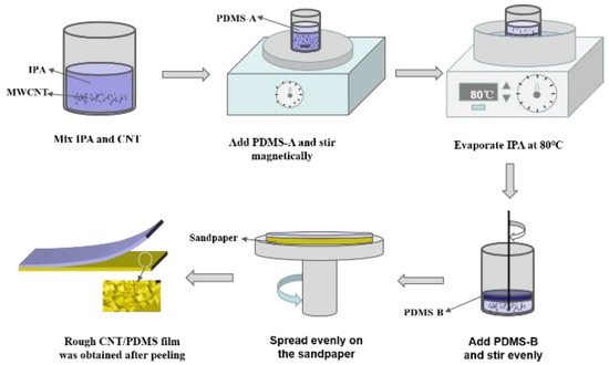 The detailed preparation process was as follows. Firstly, MWCNT and isopropanol were mixed at a weight ratio of 50:1, and ultrasonicated for 1 h. Secondly, the solution was added to PDMS-A, and the solution was placed on a magnetic mixer to stir evenly for 4 h to ensure the MWCNT and PDMS were fully mixed. Thirdly, the solution was heated in an oil bath. It was stirred at 80 °C for 2 h to fully volatilize the isopropanol in the solution. Fourthly, a curing agent (PDMS-B) was added and stirred evenly. Then the mixture was put into a vacuum drying oven and dried at room temperature for 1 h to remove bubbles, then CNT/PDMS composites were prepared. Fifthly, the mixture was uniformly coated onto sandpaper by a rotary coater. It was then cured in an oven at 60 °C for 2 h. Finally, it was stripped to obtain a rough CNT/PDMS film.