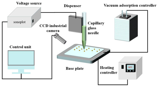 The microstructure array of the electrode layer and the interdigital electrode were prepared by SonoPlot GIX Microplotter II printing equipment. The equipment was mainly composed of a high-precision mobile operation platform, a real-time monitoring CCD industrial camera, a capillary glass needle, a distributor, a voltage source, a vacuum adsorption controller, a heating controller, and a control unit. The equipment is shown in Figure 3. Its working principle was that the liquid at the tip of the glass tube needle contacted the surface of the substrate to form a “liquid bridge” to connect with the substrate. At the same time, the distribution voltage was applied to make the glass tube vibrate, which ensured the continuous flow of liquid from the tip.