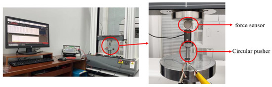 To evaluate the sensing performance of the sensor, the flexible pressure sensor was connected to the electrical sensing analyzer through conductive copper wires, and it was placed on the pressure testing machine for real-time sensing recording. The testing device is shown in Figure 6. The electronic universal material testing machine set the force loading mode on the computer, and monitored the applied force in real time through the force sensor. External force was applied to the sensor through a circular loader with a diameter of 10 mm.