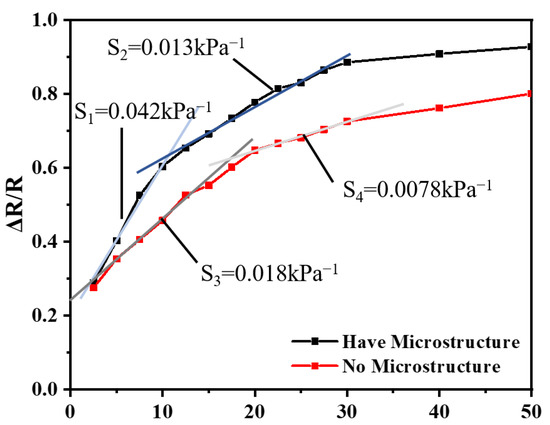 where R0 is the initial resistance of the device without pressure, R is the resistance after applying pressure, and Δp is the change in the pressure value. The sensitivity of the flexible pressure sensor with and without microstructures under different pressures is shown in Figure 7. It was demonstrated that the sensitivity of the flexible pressure sensor with microstructures was significantly better than that of the one without microstructures. The sensitivity with microstructures was 0.042 kPa−1 under pressure from 2.5 to 10 kPa, and the sensitivity was 0.013 kPa−1 under pressure from 10 to 30 kPa, which was lower by more than 69%. The performance was better than that of the flexible sensor fabricated by the traditional inverted mold method. This was due to the difference in the contact area when the sensor worked.