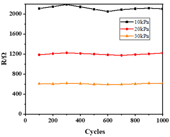 To test the stability of the sensor, the sensor was tested for 100 cycles under pressures of 10 kPa, 20 kPa, and 30 kPa, as displayed in Figure 9. The results showed that the relative resistance change rate of the flexible pressure sensors was almost unchanged and became steady. Therefore, the flexible pressure sensors fabricated by low-frequency ultrasonic resonance printing had good stability.