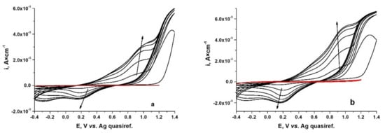 The first step was the study of PPy layers growing from ionic liquids as an electrolyte on the two types of CoCr alloys. Cyclic voltammetry was used to observe the behavior of CoCr-based alloys in an ionic liquid consisting of choline chloride-malonic acid- acetonitrile and 0.5 M monomer. Figure 1 shows examples of multicycle voltammograms (CVs) recorded during PPy development on WBC (Figure 1a) and Hera (Figure 1b) alloys. The red line shows the cyclovoltammograms obtained for the CoCr studied alloys in electrolyte without the Py monomer.