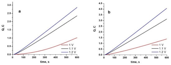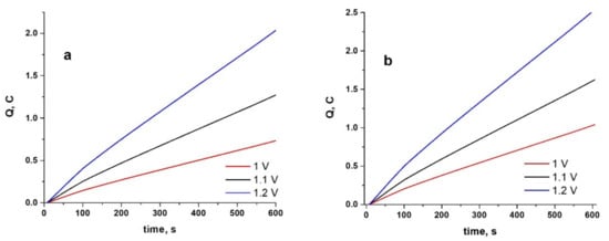 Charge–time plots during electrosynthesis of PPy at different constant potentials for 600 s on WBC (a) and Hera (b) CoCr alloys from ionic liquid electrolyte containing 0.5 M Py and 0.025 M Indo.
