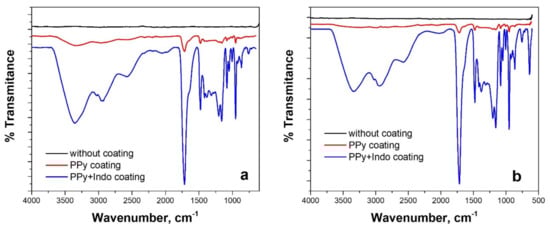 FTIR spectra of electrochemically synthesized PPy and PPy-Indo coatings on WBC (a) and Hera (b) CoCr-based alloy substrates from ionic liquid-based electrolyte.
