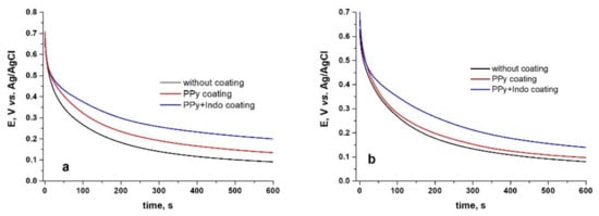 It can be said that the PPy or PPy-Indo coating of the two CoCr-based alloys studied leads to a slightly more electronegative value of the stabilized potential compared with uncoated alloy.