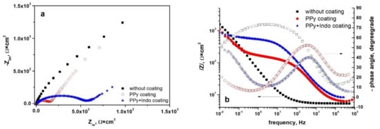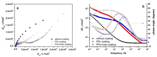 Similar behavior was recorded for the spectra recorded for the Hera-type alloy in Tani-Zuchi artificial saliva and shown in Figure 8a as Nyquist diagrams, showing the dependence of imaginary part of impedance vs. real part of the impedance and Figure 8b as Bode diagrams, pointing simultaneously two dependencies: impedance modulus vs. frequency and phase angle vs. frequency. The decrease in the maximum phase angle values from −74° (for uncoated Hera alloy) to −42° (for PPY-Indo coated Hera alloy) is more pronounced than in the case of WBC type CoCr based alloy.