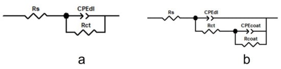 The model provided in Figure 9a was applied for the uncoated CoCr alloys, which is a simple Randles circuit consisting of the electrolyte resistance between the working and reference electrodes (Rs) and a parallel combination of the double layer capacitance, CPEdl. To describe the electrolyte–substrate interface, a charge transfer resistance, Rct, was provided to the equivalent circuit. The model in Figure 9b was employed for the PPy or PPy doped with drug coated CoCr samples. Specifically, the proposed model for uncoated alloys was completed with the coating capacitance (CPEcoat) and the coating resistance (Rcoat).