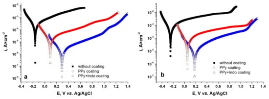 In order to apply another electrochemical characterization method, the polarization curves for the coated and uncoated CoCr based alloys were recorded. As can be seen from Figure 10, coating the CoCr alloys with PPy or PPy-Indo leads to a shift towards more electropositive values of the corrosion potential.