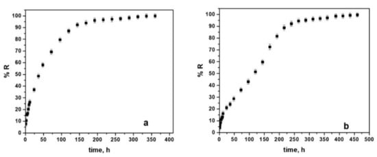 In the case of the drug embedded in the electrosynthesized choline chloride-based electrolyte coating on the Hera-type alloy, the release is shown in Figure 11b, pointing to an initial burst release of about 17% during the first 10 h, followed prolonged release phase up to 250 h and a continuous prolonged release phase up to 460 h.