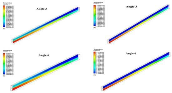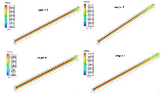 The comparison of velocity distribution in the flow field of fluid at different angles and two different Reynolds numbers (200 and 900) are shown in Figure 5. It can clearly be seen that velocity decreases slightly with an increase in angle from 3° to 5° at both Reynolds numbers, i.e., 200 and 900. This happens due to the fact that the surface area of the base of the microchannel increase with the increase in angle. The higher surface area of the base provides a higher heat dissipation to the water. Similarly, velocity decreases with an increase in angle from 3° to 5° in the case of Reynolds number of 900. However, there are significant changes in velocity distribution when the Reynolds number changes from 200 to 900.