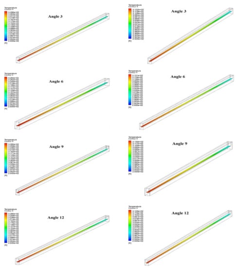Figure 7 shows the temperature distribution at the mid plane of a microchannel heat sink and fluid domain for the different angles at different two Reynolds numbers, i.e., 200 and 900. The bottom wall where the electronic chips are attached shows the maximum temperature. The temperature of coolant flow shows increases in temperature through the flow direction, and the maximum temperature is at the exit of the microchannel. It can be seen that the temperature of fluid increases from inlet to outlet for all angles at both values of the Reynolds number. Moreover, the temperature of the microchannel increase from the fluid inlet to a fluid outlet for all angle at both Reynolds number, which is expected. However, the maximum temperature slightly decreases with an increase in angle from 3° to 15° at both Reynolds numbers. The comparatively lower temperature indicates the heat dissipation rate is higher. Moreover, the maximum temperature decreases significantly when the Reynolds number changes from 200 to 900. It is due to the fact that higher Reynolds numbers extract more and more heat due to suppression of the viscous laminar layer.