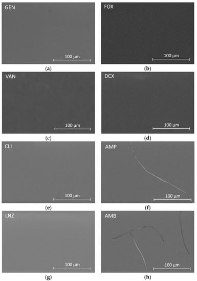 Micrographs obtained with CBS detector by SEM of the biofunctionalized coatings with different antibiotics: (a) gentamicin, (b) cefoxitin, (c) vancomycin, (d) dicloxacillin, (e) clindamycin, (f) ampicillin, (g) linezolid, and (h) amphotericin B at the concentrations described in Table 1.