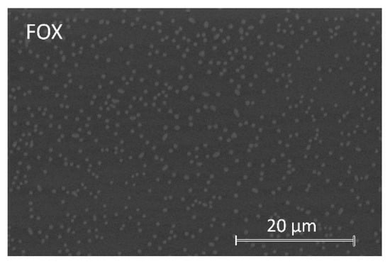 On some of the surfaces of coatings, bright spots were observed distributed in a darker matrix, suggesting the presence of two well-differentiated phases. These coatings are those containing GEN, FOX, VAN, DCX, CLI, and LNZ. These bright spots change in size and quantity with each coating. The micrograph in Figure 2 is an example of such a surface observation on a FOX-containing coating.
