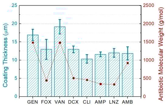 The obtained differences in the thickness of the coatings could be related to multiple factors such as molecular weight, chemical nature, solubility, and concentration of the incorporated antibiotic. Although more testing would be needed to determine the contribution of each of these factors to the final thickness, the molecular weight is a highly influential factor; this can be observed in the five coatings (GEN, FOX, VAN, DCX, CLI) with a very similar amount by weight of added antibiotic in the sol-gel and yet markedly different thicknesses, which correlate well with the molecular weight, increasing for higher molecular weight antibiotics (GEN and VAN), as shown in Figure 3.