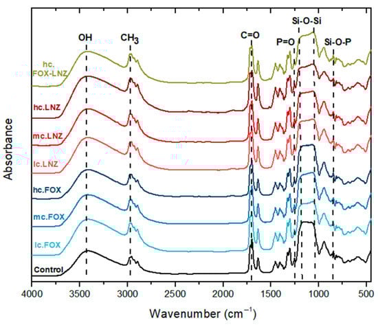 Representative FTIR absorption spectra of the studied sols containing FOX (hc., mc., and lc.), LNZ (hc., mc., and lc.), and FOX-LNZ (hc). As reference the spectrum of the control sol is depicted.