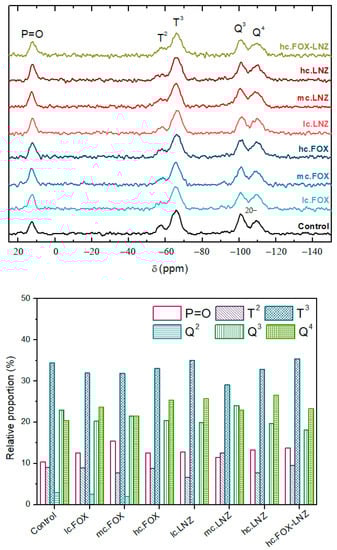 The antibiotics’ introduction slightly modified the contribution of each precursor to the crosslinking. An increase in the intensity of the P=O signal and attenuation of Tn and Qn species were observed. Moreover, the Tn species intensity decreased more than the Qn species signal. The number of fully condensed species increased in Q species.