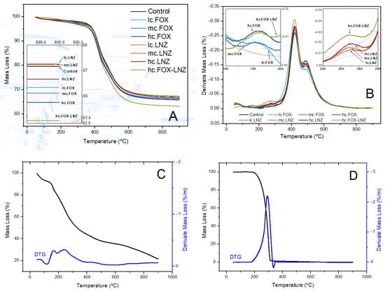 TGA (A) and DTG (B) profiles of the xerogels obtained during the syntheses. TGA and DTG profiles of the cefoxitin sodium Salt (FOX) (C) and linezolid (LNZ) (D).