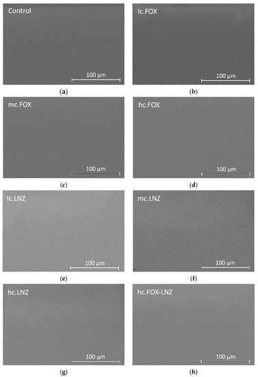 SEM micrographs for prepared coatings: (a) Control, (b) lc.FOX, (c) mc.FOX, (d) hc.FOX, (e) lc.LNZ, (f) mc.LNZ, (g) hc.LNZ, and (h) hc.FOX-LNZ deposited on TiPM substrates.