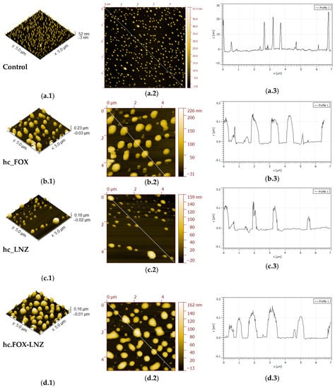 Representative non-contact mode AFM 3D topography images (a.1), (b.1), (c.1), and (d.1) of the thin films prepared onto TiPM substrates by sol-gel dip coating with (a.2), (b.2), (c.2), and (d.2) respective 2D surface morphology and (a.3), (b.3), (c.3), and (d.3) section profiles recorded along de white line indicated (scan area = 5 × 5 µm2). From top to bottom: Control, hc.FOX, hc.LNZ, and hc.FOX-LNZ film measurements (Dark colors indicate depressions, light colors protrusions).
