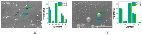 A semiquantitative microanalysis was performed using SEM and EDS to confirm the protrusion’s identity. A very low vacuum with high magnifications was necessary to obtain these images (Figure 9). According to the obtained compositional analysis for both the hc.FOX and hc.LNZ samples, in the bright areas (corresponding to the protuberances) there was a decrease in the C and Si elements and an increase in N and P elements. In the case of hc.FOX, the Na element was present only in the bright areas.